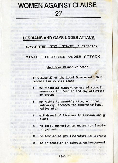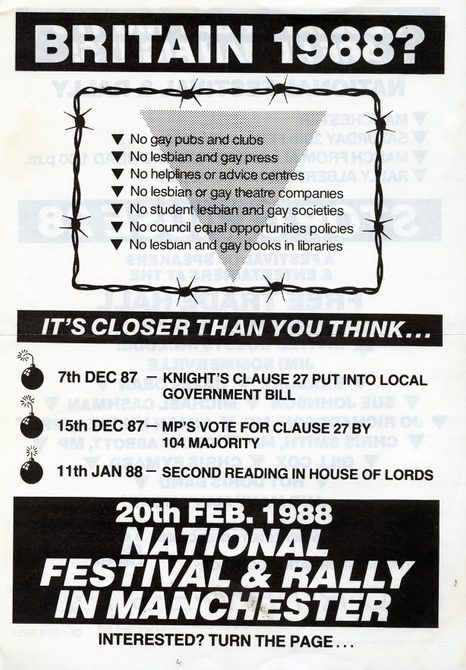 Newspapers capitalised on this story, with The Sun publishing an article called: "Vile book in schools!" There was also increasing homophobia in the mainstream press due to the Aids crisis and, when Margaret Thatcher spoke at the 1987 Conservative Party Conference, she declared how children were "being taught that they have an inalienable right to be gay" and "all of those children are being cheated of a sound start in life".