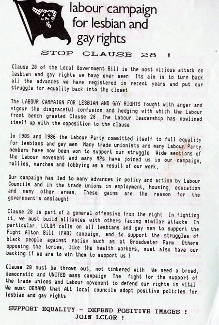 Section 28 (otherwise known as Clause 28 and Clause 27) was introduced the year after this conference, and there were demonstrations in protest of the legislation. This included protestors abseiling into the House of Lords and crashing BBC News.