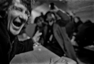St Botolph’s Crypt Shelter was a ‘wet’ shelter for the homeless, offering tea and sandwiches, somewhere warm and dry to sit, booze, talk, fight and get a little food. While other shelters turned away alcoholics and addicts, St Botolph’s welcomed anyone and everyone. I remember arriving at the top of the steps outside the crypt and just standing there, frozen, too scared to go down. The noise was deafening and the hot, wet stink of cheap cider, meths, urine and unwashed bodies drifting up from below was overpowering. I was frightened but I knew it needed documenting.