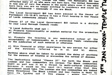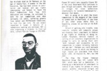 In 1982 the Gay Black Group approached the Greater London Council (GLC) with a request for funding to create The Black Lesbian and Gay Centre in response to some of the issues facing LGBTQ+ people of colour. These issues included the overwhelming whiteness of the ‘mainstream’ LGBTQ+ scene, racism from within and outside of the scene, and the difficulties of coming out to families, who generally perceived homosexuality as a ‘white’ issue.