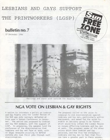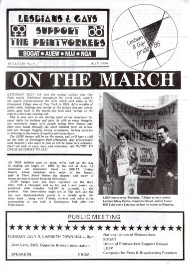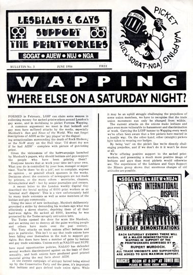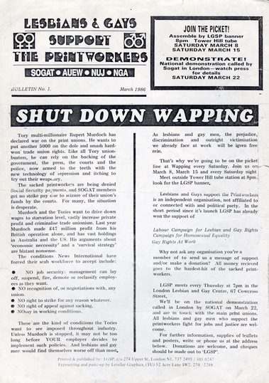Lesbians and Gays Support the Printworkers (LGSP) came together to support workers fighting sacking and victimisation of employees of Rupert Murdoch’s News International in London.