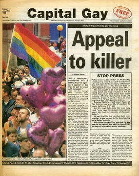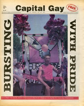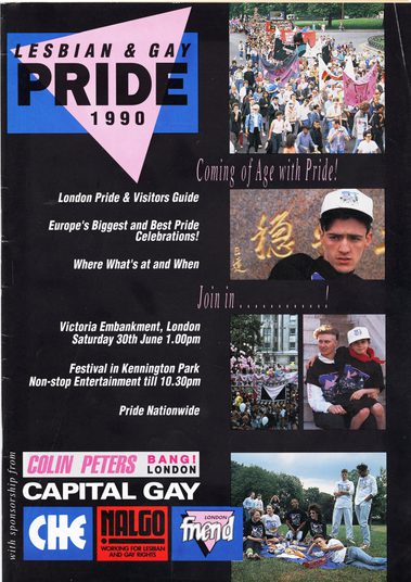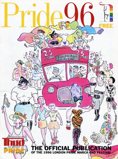 A collection of programmes, news coverage and badges relating to London Pride events in the 1990s.