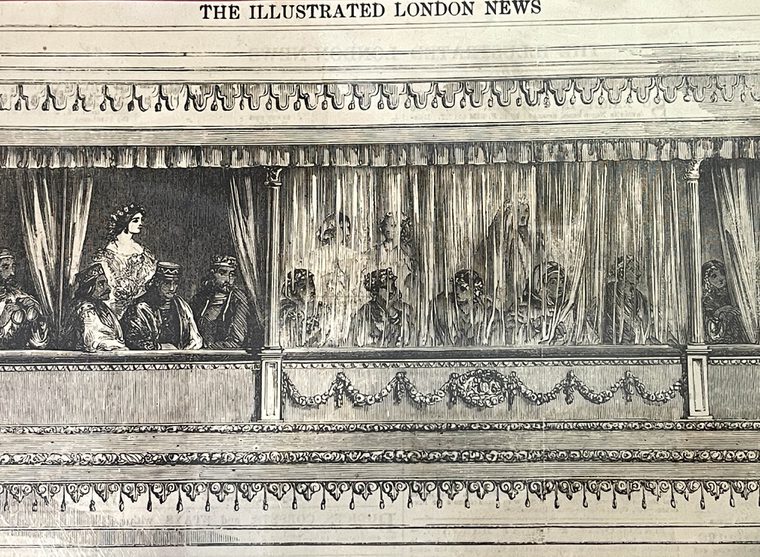The display case also includes three items which remind us that there was a female South Asian presence in Britain before the Second World War. The first of these is an engraving from The Illustrated London News (1857). The engraving forms part of a short article that tells us about the Queen of Oude’s state visit to the Theatre Royal in London’s West End.[1] The text does not include the Queen’s name, Begum Hazrat Mahal.[2] Nor does it mention that she was one of the few women who challenged British rule in India, leading local resistance against the British East India Company during the Indian Mutiny of 1857-1858. Instead, the article pays attention only to the visitor’s modesty and dress.